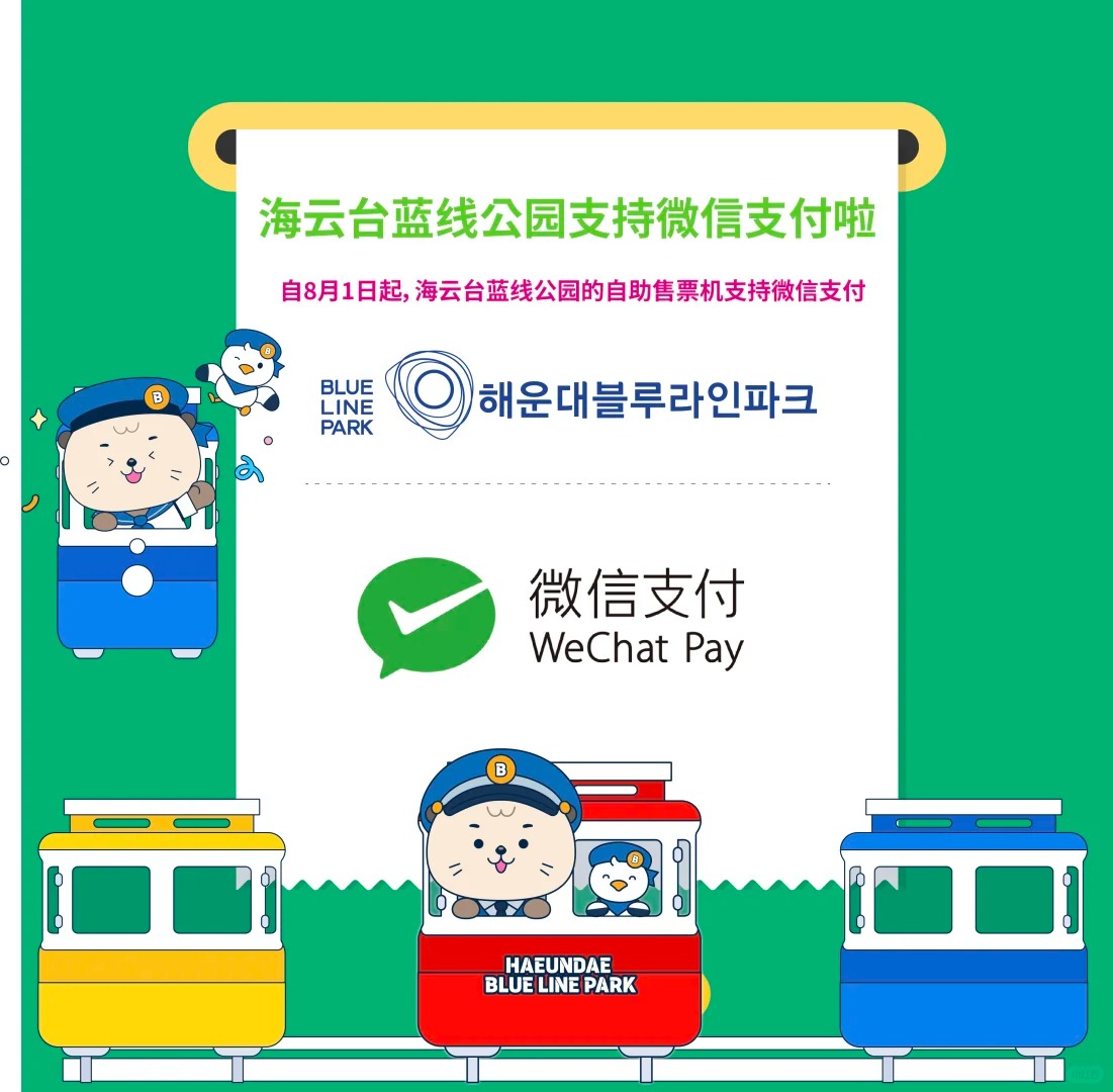 自2025年8月1日起,海云台蓝线公园现场售票处、自动售票机及官方网站 均可使用全球支付服务——微信支付(WeChat Pay)进行付款。