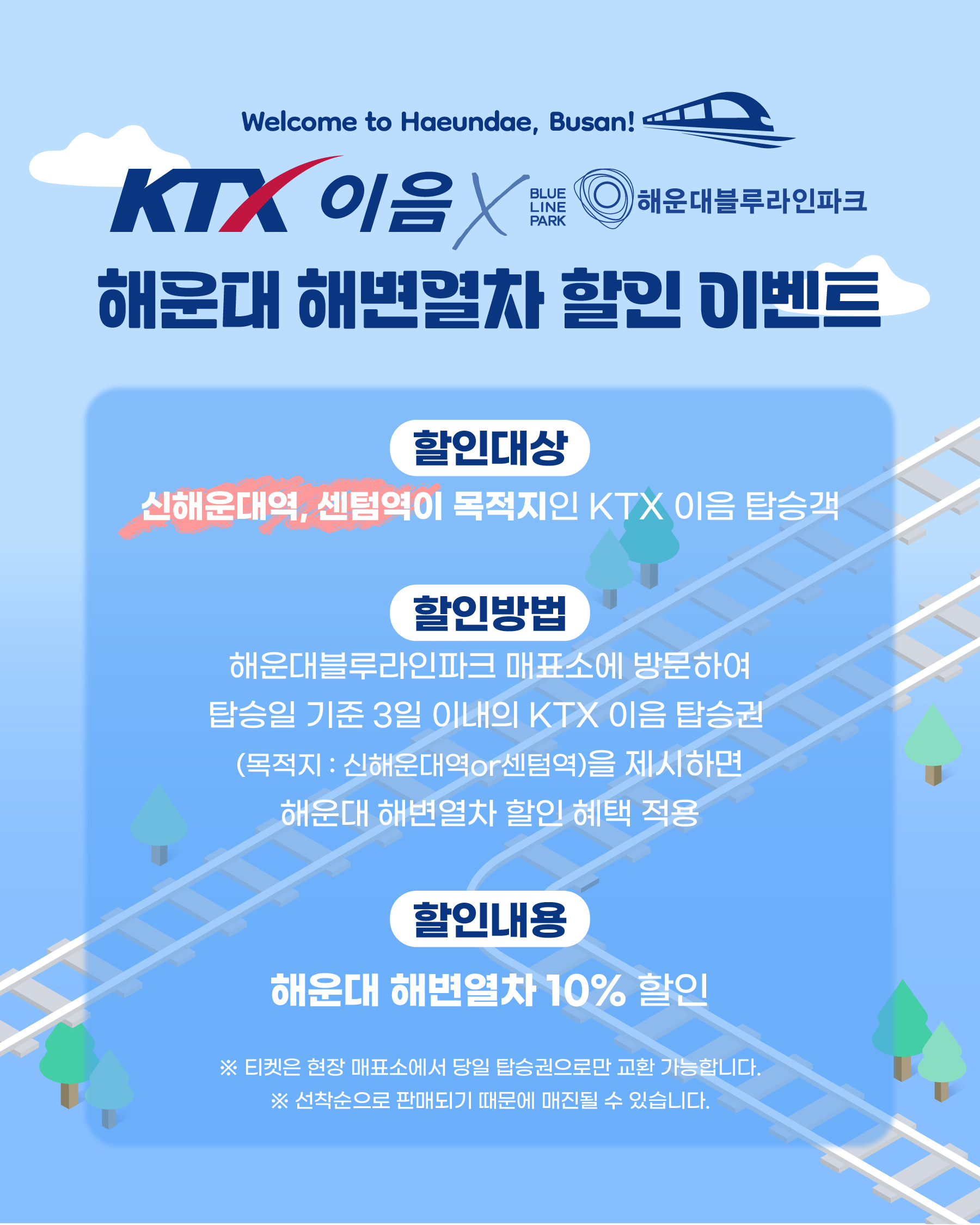 ▶ 할인 방법 : 해운대블루라인파크 매표소 방문 후 탑승일 기준 3일 이내의 KTX-이음 승차권 (목적지: 신해운대역 또는 센텀역) 제시